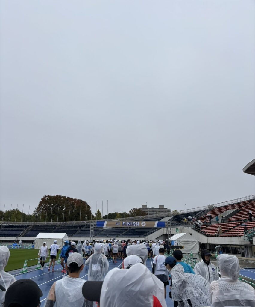 大会当日。あいにくの雨。それも結構激しく降っていました。受付がある駒沢公園までは徒歩で移動。シューズはずぶ濡れです。寒さがそこまでではなかったのと、会場の足元が良かった(コンクリート)ので、スタート前に心が折れることはありませんでした。以前、河川敷での大会で雨が降り、気温も低く、足元は泥だらけになり、棄権してしまったことがありました(苦笑)。駒沢公園は屋根もありました。