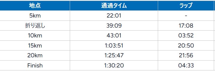 タイムは1:30:20(ネット1:29:59)。目標こそ達成できませんでしたが、PBは更新できました。大会後は久しぶりに歩いたり、階段の下りで足がしばらく痛み、このタイムがいっぱいいっぱいだったなと思いました。次は余裕をもって1時間30分切りを目指します!